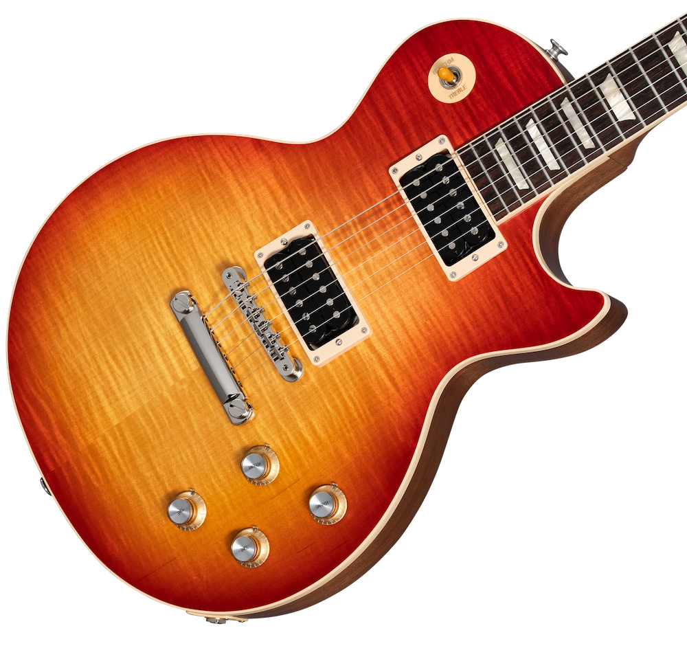 The Les Paul Standard returns to the classic design that made it relevant, played, and loved - shaping sound across generations and genres of music. A tribute to Gibson's Golden Era of innovation and brings authenticity you can have back to life. The Les Paul Standard '60s features a satin nitrocellulose lacquer finish that gives it the look and feel of a long-treasured musical instrument. It has a solid mahogany body with an AA figured maple top and a SlimTaper '60s-style mahogany neck with a rosewood fingerboard and trapezoid inlays. It's equipped with an ABR-1 Tune-O-Matic bridge, aluminum Stop Bar tailpiece, Grover Rotomatic "Kidney Bean" tuners, and gold Top Hat knobs with Silver Reflectors and Dial Pointers. The open-coil '60s Burstbucker pickups are loaded with Alnico 5 magnets and hand-wired to audio taper potentiometers and Orange Drop capacitors. Whew! It's a rock machine! • MFSKU LPS6F002HNH1 • UPC 711106095998