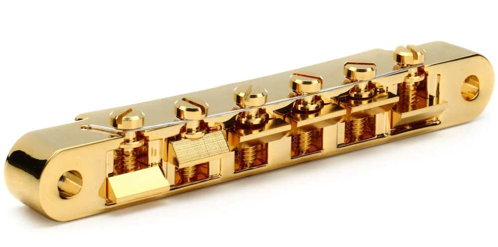 This is the genuine bridge, from the manufacturer who makes the originals. Manufactured since the 1950s, this Tune-o-matic bridge is 100% true to the original. The brass saddles are supplied without notches, for custom string spacing in your shop. The adjustable intonation screws are held by a retainer wire. Knurled height adjustment thumbwheels and threaded mounting posts are included. Gold! • MFSKU PBBR-020 • UPC 711106550022