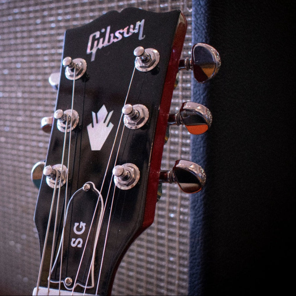 Gibson SG guitar headstock with tuning pegs against a blurred background