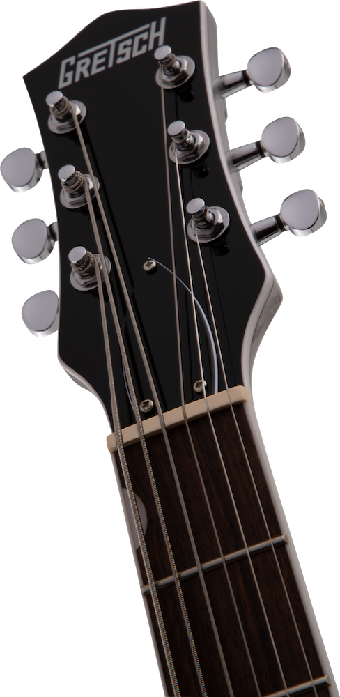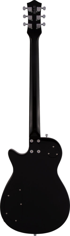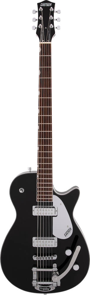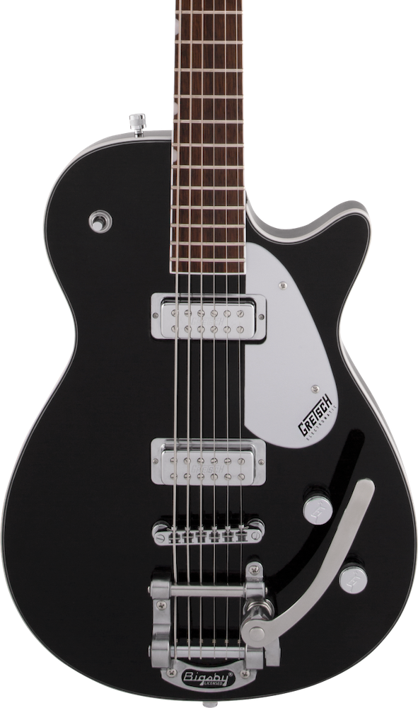 The all-new G5260T Electromatic Jet Baritone with Bigsby captures essential Jet power and fidelity at sub-sonic levels. The Jet Baritone rattles foundations with dual Gretsch mini humbucking pickups that capture thundering lows while retaining a piano-like articulation and definition for intoxicating sonic size and width at every level of gain. Simple tone-shaping is provided by a three-position toggle switch as well as master volume and master tone controls. An elongated 29 ¾”-scale accommodates lower tunings without loss of string tension, while the sturdy bolt-on maple neck is topped with a comfortable 12” radius laurel fingerboard featuring 22 medium jumbo frets. Other premium features and appointments include an anchored Adjusto-Matic bridge, Bigsby B50 tailpiece, pearloid Neo-Classic inlays, white binding with purfling and chrome hardware. Crafted with unmistakable Gretsch sound, style and playability, the G5260T Electromatic Jet Baritone with Bigsby is available in classic Black with silver pickguard or in a striking Airline Silver finish with black pickguard. • MFSKU 2506001506 • UPC 885978415892