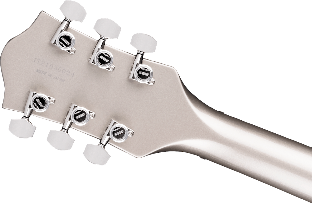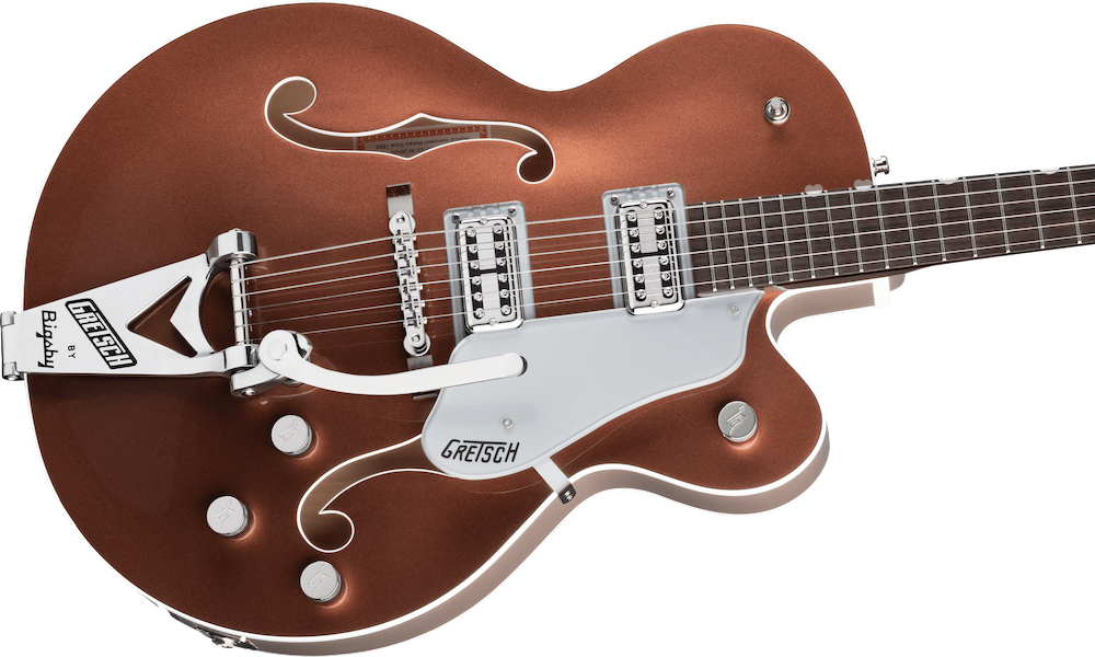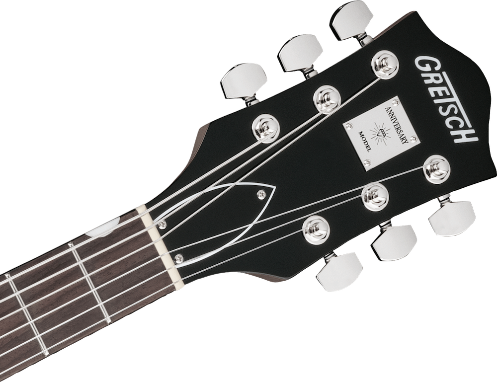 Two-tone and with a String-Thru Bigsby! The world’s greatest hollow body guitars. Designed for working professional, Gretsch all-new Players Edition Hollow Body instruments preserve the authentic Gretsch sound and style while incorporating cutting-edge features for maximum power, comfort and versatility. At the intersection of innovation and tribute, you'll find the G6118T Players Edition Anniversary Hollow Body with String-Thru Bigsby - a guitar that honors its inspirational past while remaining firmly rooted in the future of music. Engineered for optimum performance and responsiveness, it reacts instantly to your every musical move, not just earning, but demanding a place in your sonic arsenal. The all-new FT-67 Filter’Tron humbucking pickups were designed to capture authentic vintage Gretsch voicing but with a more well-rounded tone for modern playing styles. This powerful pair of pickups provide open and pristine top-end chime, glassy midrange, robust low end and balanced harmonics for tone that blends seamlessly with other instruments. The innovative Gretsch “ML” bracing delivers huge hollow body sound from the comfortable 2.5”-deep maple body. The control complement — separate bridge and neck volume controls, three-way pickup toggle switching, no-load master tone and master volume — allows for infinite tonal variations. Our “Squeezebox” capacitor adds smooth vintage tone while the all-new treble bleed circuit lets your guitar retain all of its tasty clarity when rolling the volume control down. Designed to instill complete confidence from tailpiece to tuners, the G6118T Players Edition Anniversary Hollow Body with String-Thru Bigsby can be trusted on every song, every night for powerful sound, tonal flexibility and full control of that classic Gretsch power. • MFSKU 2401157831 • UPC 885978882922