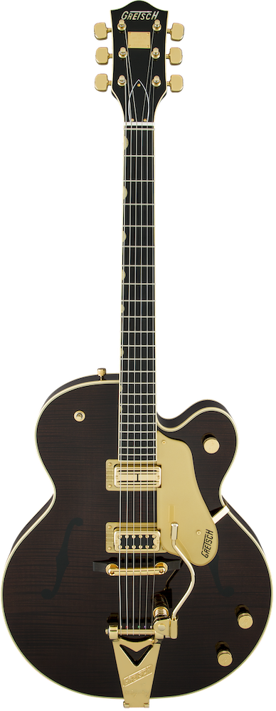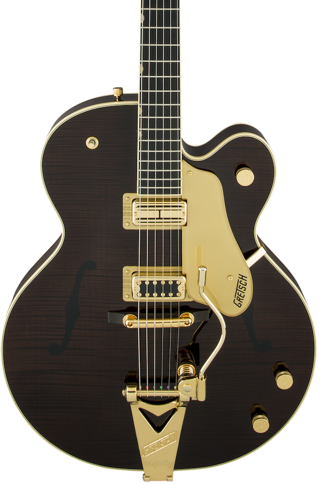 A pair of TV Jones® pickups - a Super'Tron Classic Plus bridge pickup and Super'Tron neck pickup - responds to every stroke with defined, eloquent tone. The modified control layout features an individual bridge pickup volume, and master volume and tone controls, allowing you to create countless tonal variations. Add the new Gretsch "Squeezebox" capacitors and you get incredibly silky vintage high end. The standard "U"-shaped maple neck with 1.75" nut bears a 12"-radius ebony fingerboard with 22 vintage-style small frets and is a picker's dream. A pinned "rocking" bar bridge works with the Bigsby® B6GWVT vibrato tailpiece for stable tuning while the vintage-style genuine bone nut lets the strings slide freely without binding in the slots.