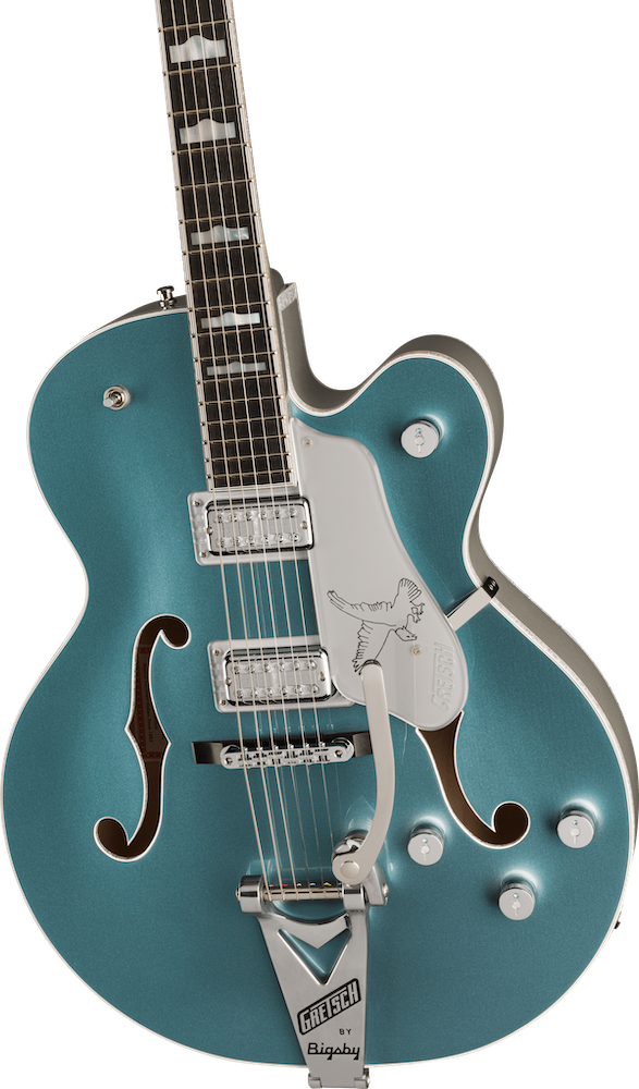 Get'cher calendars out, because 2023 marks the “Double Platinum” Anniversary for the Gretsch brand. To commemorate 140 years of unmistakable sound, Gretsch proudly present the Limited Edition G6136T-140 Falcon - a guitar that honors its inspired past while providing the power and voice for the next generation of visionary players. Featuring Solid Adirondack Red Spruce top with maple back and sides. Solid! ML bracing, 12” radius ebony fingerboard with 22 medium jumbo frets, rolled edges, and mother of pearl Hump "Alamo" Block inlays, FT-67 Filter’Tron humbucking pickups, Adjusto-Matic bridge with pinned ebony base, String-Thru Bigsby B6CP tailpiece, Grover Imperial locking tuners and so much more. Catch a bit of history while you can! • MFSKU 2401514874 • UPC 717669874902