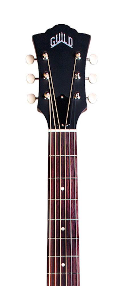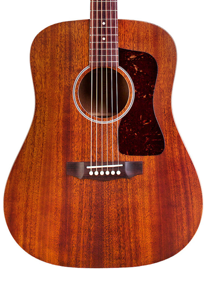 The D-20, is a dreadnought acoustic guitar built with solid mahogany top, back, and sides. First introduced to the Guild line in 1968, this model features a rosewood bridge and fingerboard, bone nut and saddle, and an extremely light satin finish that allows this guitar to truly sing. The D-20’s modest appointments include a vintage style rosette and Guild’s peak logo inlaid in mother-of-pearl on the headstock. Each D-20 comes with a hand-signed, numbered certificate of authenticity, and ships with a hardshell case. Perfect for heavy-handed strummers. Made in the USA! • MFSKU 385-0200-821 • UPC 809870301985