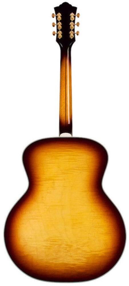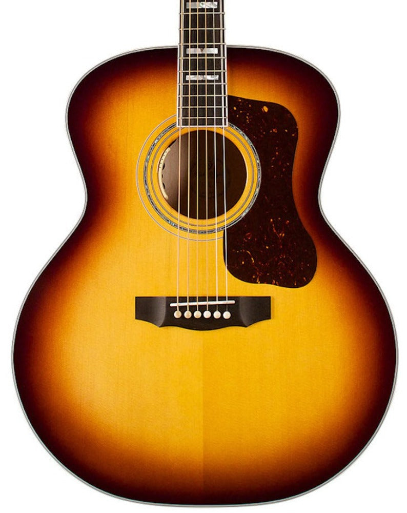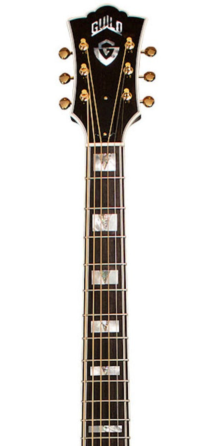 The ultimate Guild jumbo is here: the F-55 Maple, featuring a tight grained solid Sitka spruce top with arched flamed maple back and maple sides. Created on the same arch press that’s been a part of Guild manufacturing since 1985, the F-55 Maple provides sharply focused trebles and an articulate mid-range, perfect for a full, centralized, harp-like sound. Performers have long revered maple for its ability to sing over a crowded room and resist the feedback problems of boomier, bassier tonewoods, and the F-55 Maple does not disappoint. Elegant cosmetic appointments include classic Guild “V-block” inlays, gold Gotoh hardware, and a beautiful Nitrocellulose lacquer finish. Exceptional build quality and premium specifications make it a worthy heir to the historic Guild jumbo legacy. Available in Natural or Antique Burst finish , and with or without LR Baggs Anthem Electronics. • MFSKU 385-3654-837 • UPC 809870303606