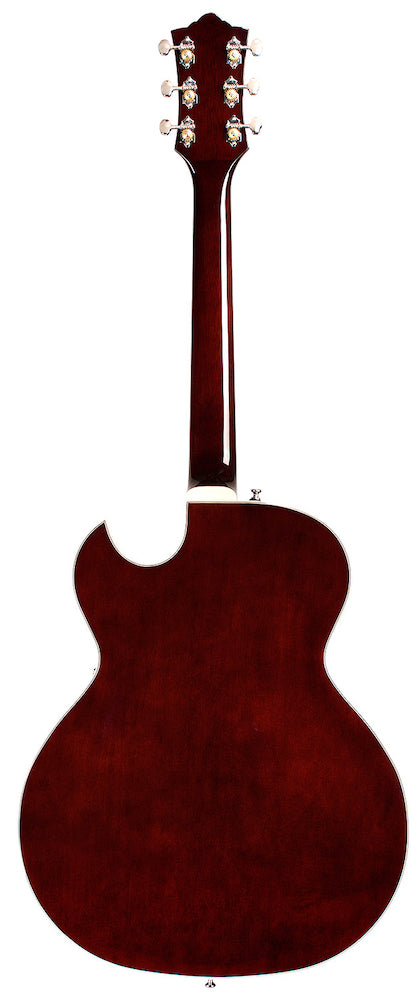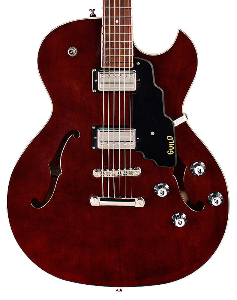 An affordably priced, single cut Starfire has arrived. Based on the timeless Starfire II and III single cut body shape, the Starfire I SC features a 2“ thick, hollow body with an added bridge block to increase bridge stability and improved resonance. Made with a sturdy arched maple top, back, and sides, the Starfire I SC has the airy tonality of a hollow body instrument with bright overtones and pronounced lows. The 24 3/4” scale length and modern thin “U” neck profile provide a fast, smooth playing neck, while the premium Guild Vintage 18 tuners and Tune-o-matic bridge ensure the strings are accessible and in tune. Rich, vintage tone is injected by Guild’s own HB-2 Alnico II humbuckers, and the push-pull coil splitting feature allows for singing, single coil tones from either pickup. All of these features come standard on the Starfire I platform. Available in Antique Sunburst or Vintage Walnut finishes. For those looking for something a little extra, the Starfire I SC GVT comes equipped with Guild’s vibrato tailpiece featuring a roller tension bar for additional tonal versatility. • MFSKU 379-1910-869 • UPC 809870308885