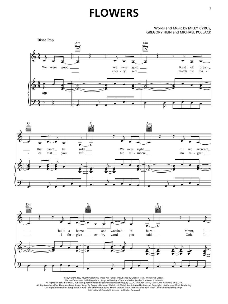 Miley Cyrus's 8th studio album was one of the most anticipated new releases of 2023 thanks to the runaway success of its debut single “Flowers” which topped the Billboard Singles chart as soon as it was released! Our matching folio features all twelve songs arranged for piano and voice with guitar chord frames. Titles include: Flowers • Handstand • Island • Jaded • Muddy Feet • River • Rose Colored Lenses • Thousand Miles • Violet Chemistry • Wildcard • Wonder Woman • You. • MFSKU HL01224089 • UPC 196288143208