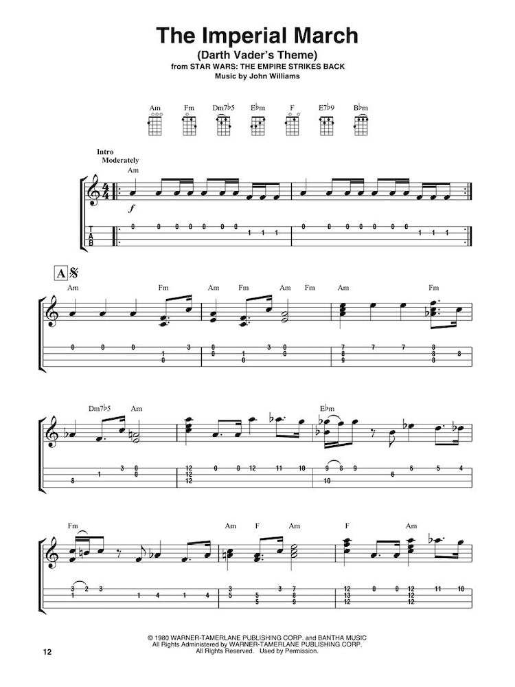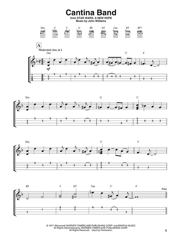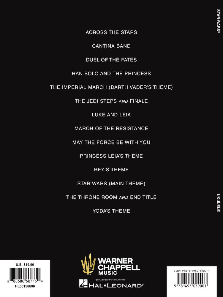 Now you can play John Williams' masterpieces from the Star Wars franchise on the ukulele in this songbook featuring notes and tab. Songs: Across the Stars • Cantina Band • Duel of the Fates • Han Solo and the Princess • The Imperial March (Darth Vader's Theme) • The Jedi Steps and Finale • Luke and Leia • March of the Resistance • May the Force Be with You • Princess Leia's Theme • Rey's Theme • Star Wars (Main Theme) • The Throne Room (And End Title) • Yoda's Theme. • MFSKU HL00156600 • UPC 888680607159