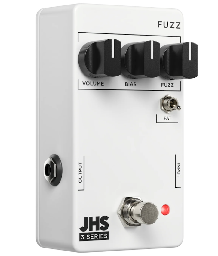 A white JHS Pedals 3 Series Fuzz Effects Pedal with knobs for volume, bias, and fuzz, as well as a fat switch. JHS Pedals 3 Series Fuzz Effects Pedal at Twin Town Guitars in Minneapolis Minnesota