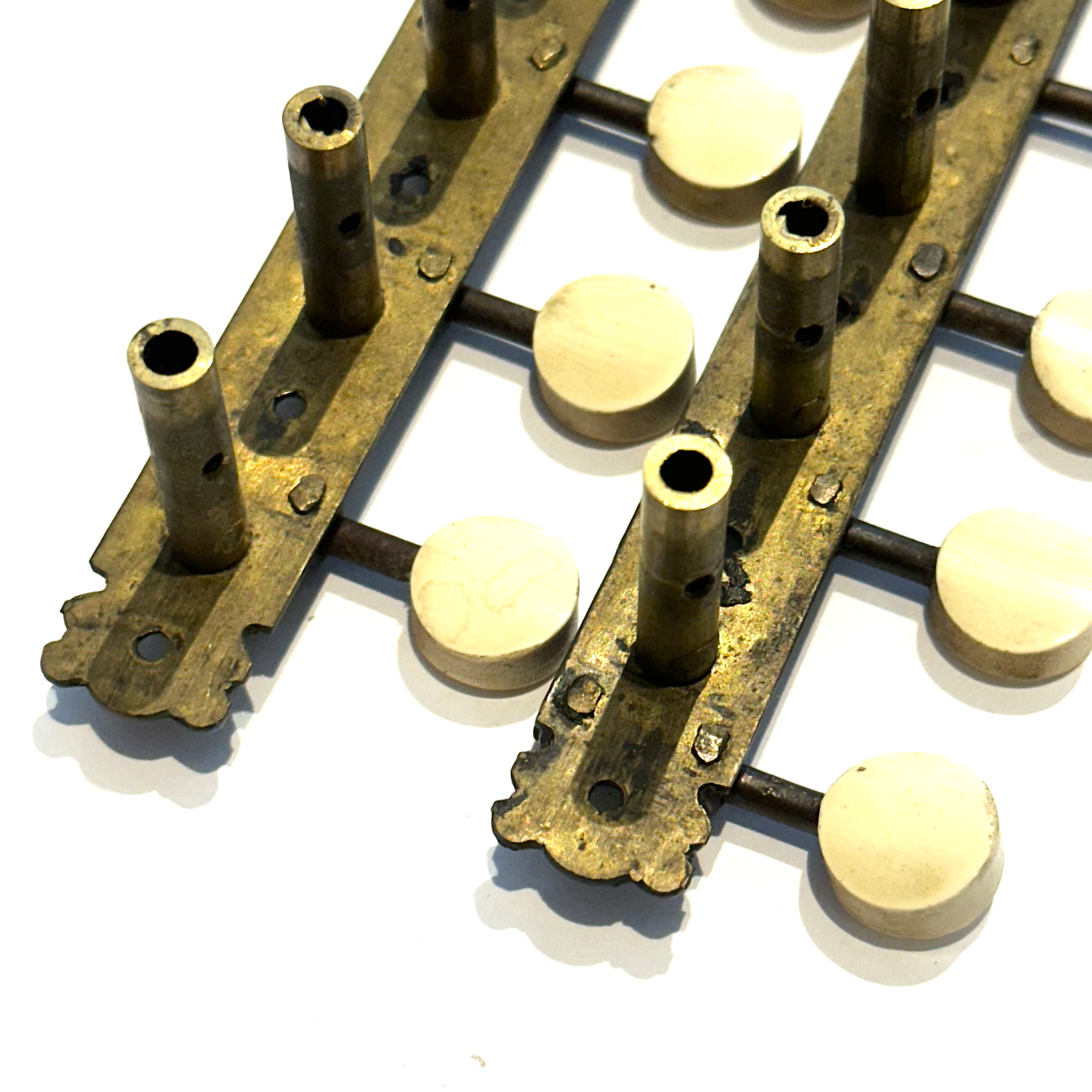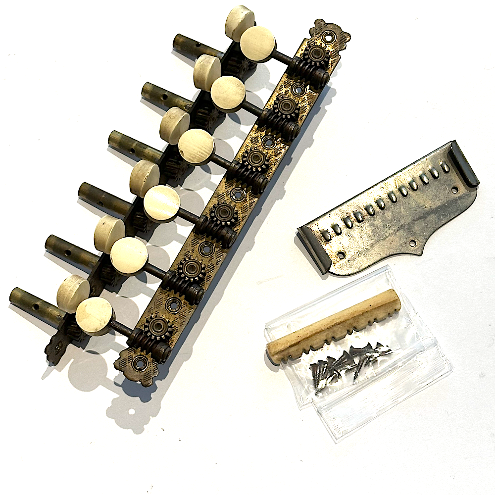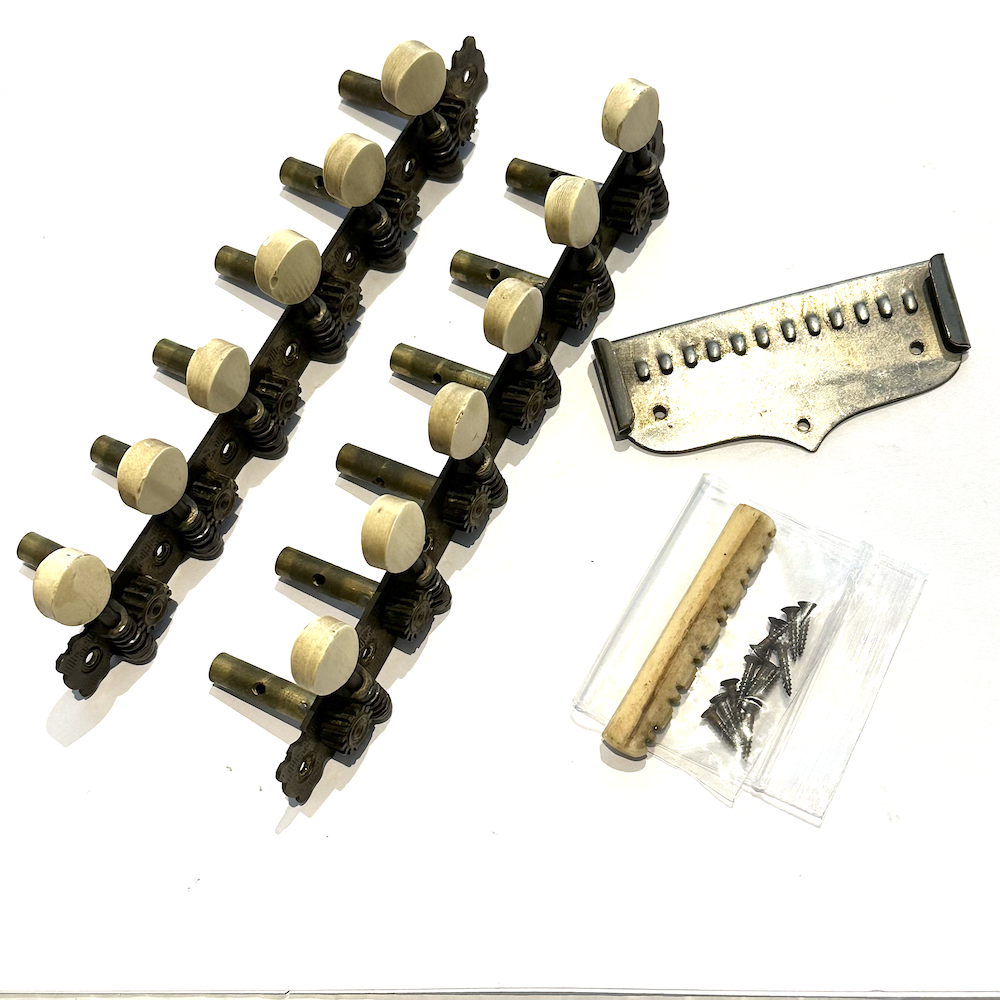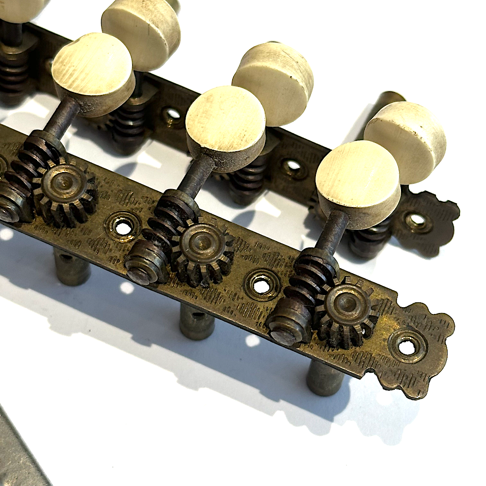 Six on an engraved strip, an early 20th century set of brass tuning machines. Sporting original bone buttons, bushings and most screws. Engravings are a nice detail, are visable and there is oxidation on the 100 year old strips that will clean up, but that'll be left to the new owner's judgement. Smooth turning.. Bonus tailpieve and bone nut. Ready for that vintage instrument!