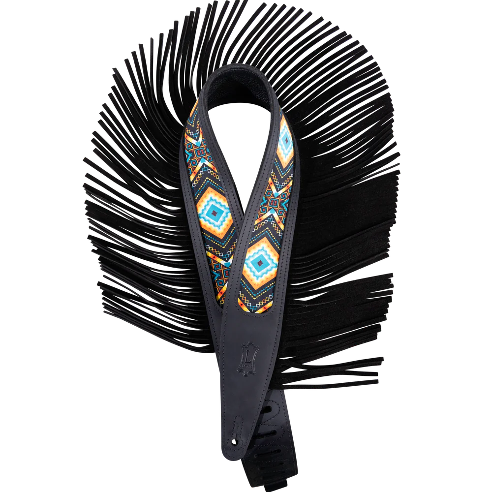 Introducing The Crazy Horse Outlaw Guitar Strap, a true embodiment of durability, luxury, and rugged beauty. Crafted from the finest Crazy Horse leather, renowned for it's exceptional quality, buttery finish, and irresistible allure. Derived from full grain cowhide, each strap undergoes meticulous smoothing, polishing, and wax treatment, ensuring a supple and lustrous texture. The true magic of Crazy Horse leather lies in it's ability to evolve over time, developing a natural patina that gives your guitar strap an individual look and a unique feel that is truly yours. The Crazy Horse Outlaw also embraces it's wild side with an eye-catching fringe detail and a bold print that evokes the spirit of the untamed West.