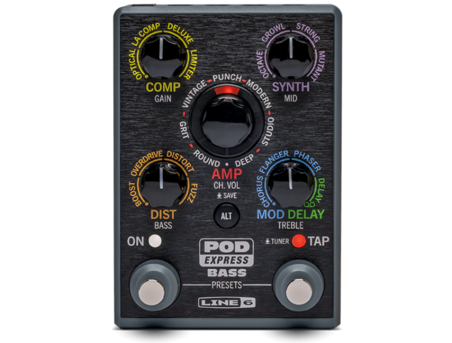 The ultra-portable POD Express Bass amp and effects processor lets you take your tones wherever you go. Simple controls make it easy to use, while models derived from the HX family of processors ensure exceptional sound quality. Powered by three AA batteries (included) or an optional 9-volt power supply. • 7 Amps, 7 cabs, and 17 effects, including a looper • MFSKU 99-060-3100 • UPC 614252340236
