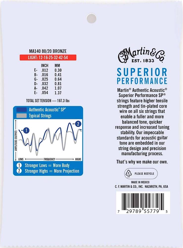Martin Authentic Acoustic strings are engineered with the performer in mind and they will always stand up to rigorous practice and performance schedules. • MFSKU MA140 • UPC 729789557795