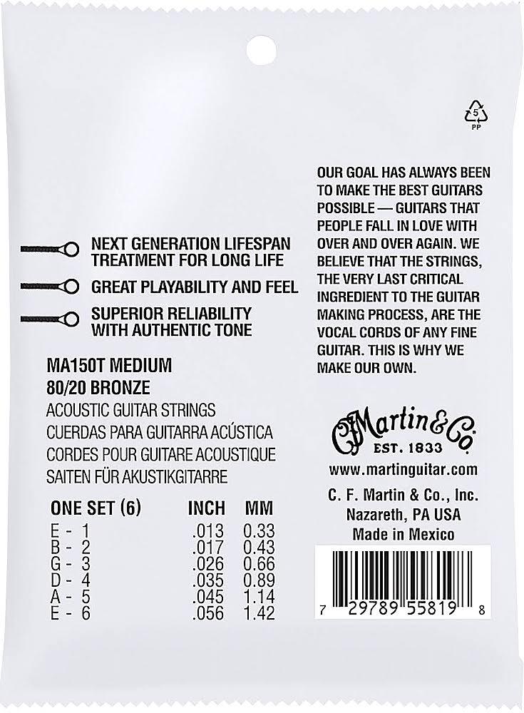 The newest generation of Martin's treated Lifespan strings are redesigned to be even better than before. Martin's new technology protects the core wire and the wrap wire to prevent corrosion, giving your strings long lasting tone and a smooth feel. • MFSKU 41Y18MA150T • UPC 729789558198