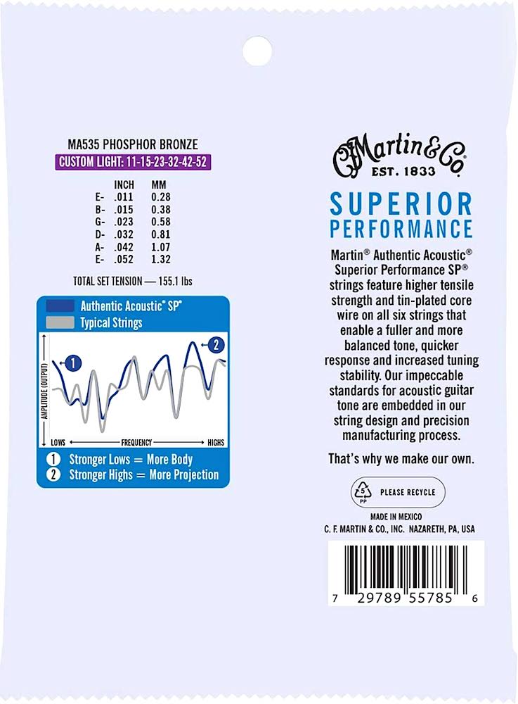 Martin Authentic Acoustic Superior Performance SP strings feature higher tensile strength and tin-plated core wire on all six strings that enable a fuller and more balanced tone, quicker response and increased tuning stability. Our impeccable standards for acoustic guitar tone are embedded in our string design and precision manufacturing process. A great string! • MFSKU MA535 • UPC 729789557856