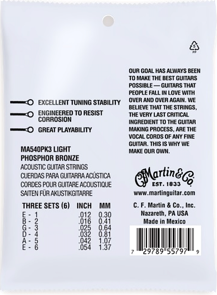 C.F. Martin Guitars MA540 SP Phosphor Bronze Light Acoustic Guitar Strings .012 -.054 - 3-Pack