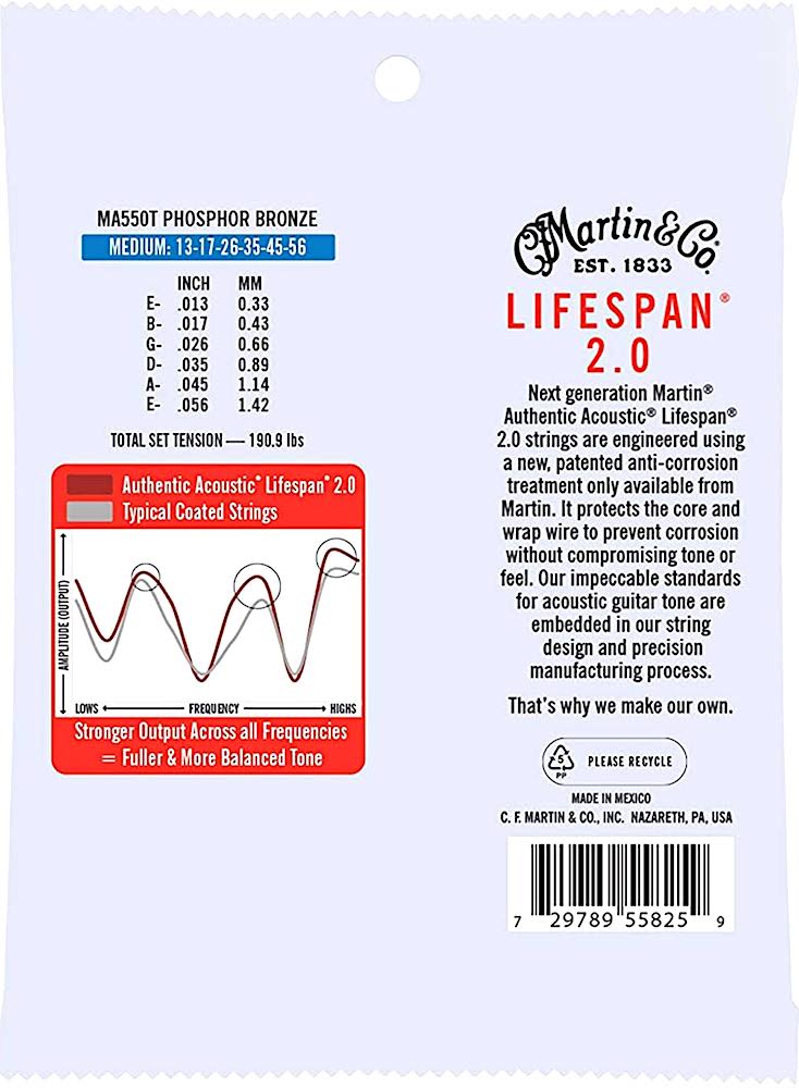 Martin's next generation Lifespan 2.0 strings are engineered using a new, patented technology only available from Martin. This technology was developed to protect the core wire and the wrap wire to prevent corrosion without compromising tone - the single most important attribute of the guitar strings. Authentic Acoustic Lifespan 2.0 strings look better, sound better, and feel better, providing a smooth playing experience that reduces finger drag. We invested two years developing our next generation Lifespan 2.0 strings to ensure they will sound better, longer than any other extended-life string on the market. Available in 80/20 Bronze and 92/8 Phosphor Bronze. Martin Authentic Acoustic Lifespan 2.0 strings offer next generation treatment for long life, great playability and feel, and superior reliability with authentic tone. • MFSKU MA550T • UPC 729789558259