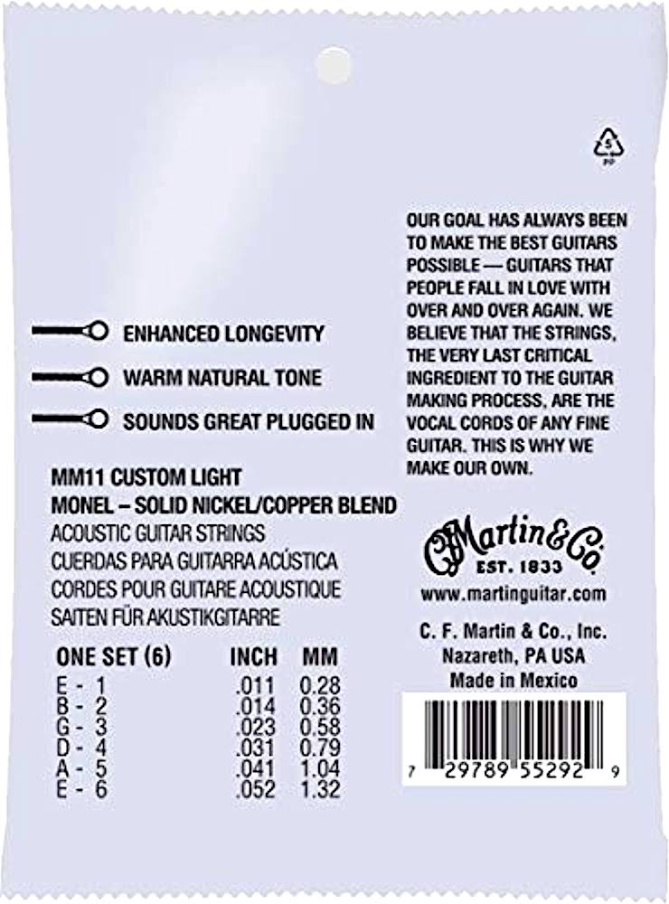 Retros are the original Nickel acoustic string all the way from the 1930s. Retro strings offer a uniquely mellow, yet crisp sound that allows your guitar’s natural tonewoods to be heard. They are crafted with Monel, a solid nickel/copper wrap wire - not nickel-plated - meaning there is no chance for defects in the plating to allow for corrosion. Martin’s proprietary wrap wire is naturally corrosion resistant and it is incredibly strong. We also employ a sophisticated winding process that controls the coupling between the core and wrap wire to maximize intonation. • MFSKU MM11 • UPC 729789552929