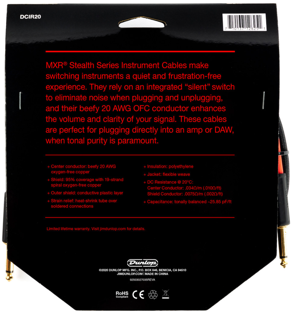 MXR Stealth Cables eliminate unpleasant noise when plugging in and unplugging from your instruments, contributing to a more efficient and frustration-free experience on stage. • MFSKU DCIR20 • UPC 710137126251