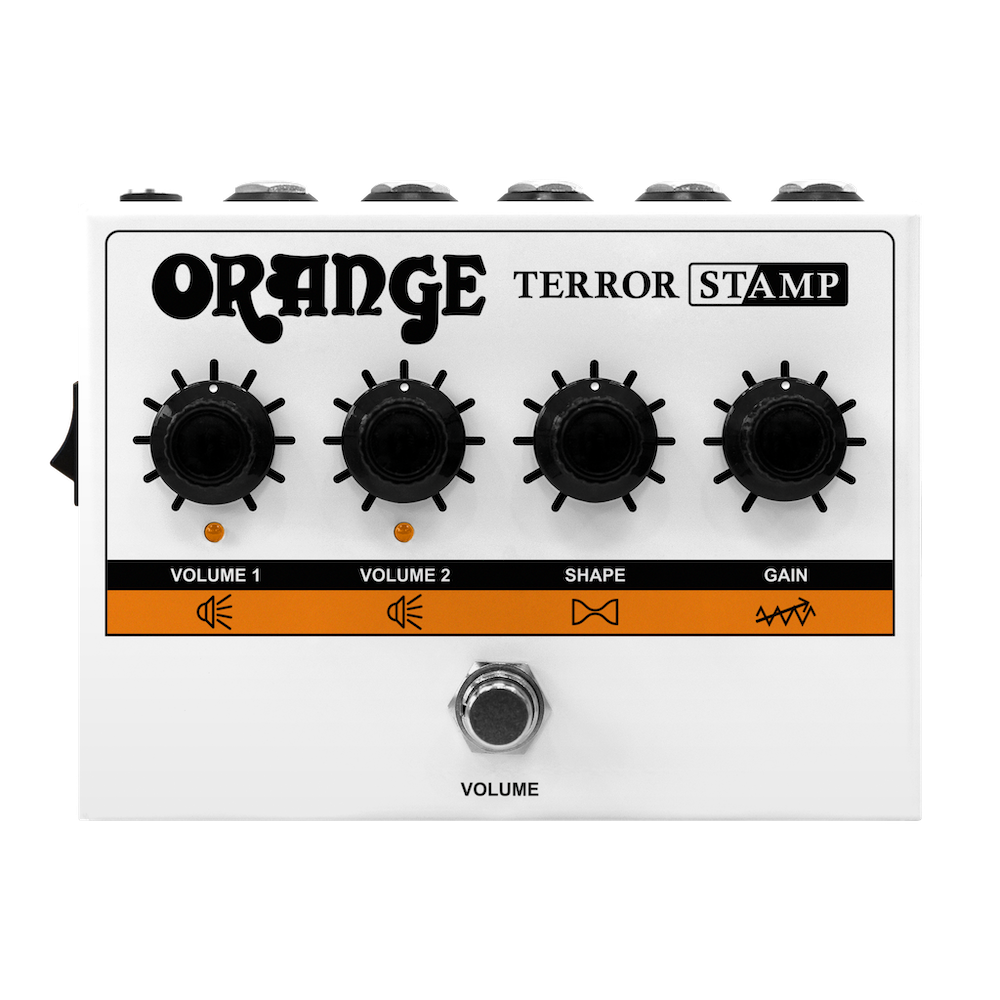 For years, the Terror series amps have proven that the biggest sounds can come in the tiniest packages. Taking pocket-sized powerhouse concept one step further, behold the Terror Stamp. Packing all of the punch of the minuscule Micro Terror and Micro Dark amps into an even smaller pedal format, this Valve/Solid State hybrid amp brings 20 Watts of killer Orange tone right onto your pedalboard. The Terror Stamp’s tiny footprint, 8/16 Ohm Speaker Output, fully-buffered FX Loop and CabSim headphone output integrate seamlessly with your other pedals, whether you’re rocking a loud stage, recording direct or practising into the early hours. The Terror Stamp is based on the Micro Dark with a few minor tweaks to the gain structure and the CabSim, with the added feature of being able to set up two volume levels and switch between them. Typically-Orange simplicity, unmistakably-Orange tone. The Terror Stamp’s hybrid Valve/Solid State design gives you the best of both worlds. From crystal-clean to thundering high-gain, the ECC83 (12AX7)-based preamp has all the harmonics, dynamics and feel you’d expect, while the 20W Class AB Solid State power amp keeps things small, dependable and sounding great at any volume. Footswitchable Master Volume controls give you the Terror Stamp’s full range of sounds at two different volumes. Jump right out of the mix for that all-important solo, without sacrificing your carefully crafted tone. Just like their full-size amps, they come with a fully-buffered, low-impedance FX Loop. Long cable runs? No Problem. True Bypass pedals? Great. The Terror Stamp fits right into your signal chain without ever compromising sound quality. Not only that, but connecting directly to the FX Return turns this little monster into a 20W power amp for whatever pedals, preamps or modellers you can throw at it – with a headphone output too! • MFSKU TERRORSTAMP • UPC 998388907076