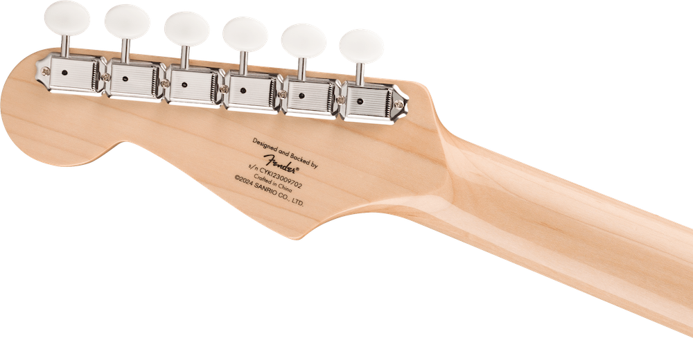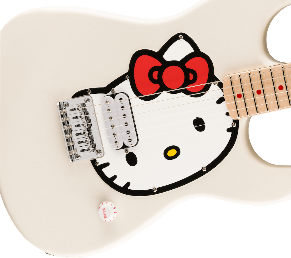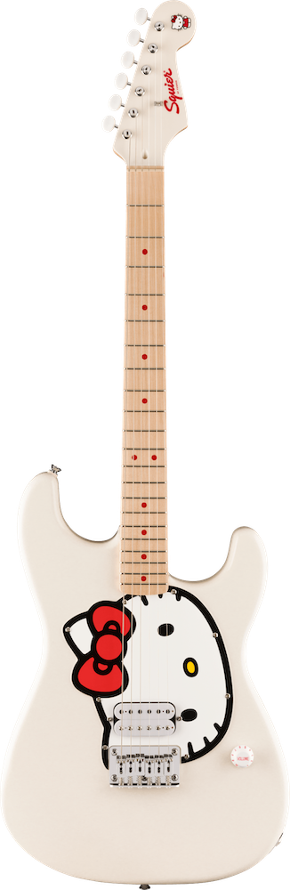 In stock now at Twin Town Guitars. As of December 1st we have 10 Available. Order fast before they're gone! Say hello to the vibrant world of Hello Kitty with the Fender x Hello Kitty collection, celebrating an iconic collaboration that transcends generations. This collection merges the bold and colorful aesthetic of Hello Kitty with the road-reliable excellence of Fender gear, delivering unparalleled performance and stylish flair. Rock out with your instrument in playful style and let Hello Kitty join you on your musical journey! In celebration of the 50th anniversary of Hello Kitty, this limited edition Stratocaster represents a riff on the original Hello Kitty model that Squier introduced in the early 2000s, combining next-level quality and features with Hello Kitty design details for what is sure to become the next collectible cult classic. With an easy-playing “C”-shape neck and iconic contoured body, this Strat delivers impressive playability and incredibly versatile tone courtesy of the Fender Designed humbucking pickup. A deluxe Hello Kitty gig bag is included. Solidbody Electric Guitar with Poplar Body, Maple Neck, Maple Fingerboard, and 1 Humbucking Pickup - White • Limited Edition • Hello Kitty graphic pickguard, body and headstock • Fender-designed humbucking pickup with volume control • Vintage-style tuning machines • Gloss finish • Deluxe Hello Kitty gig bag included • MFSKU 0379102980 • UPC 885978137848