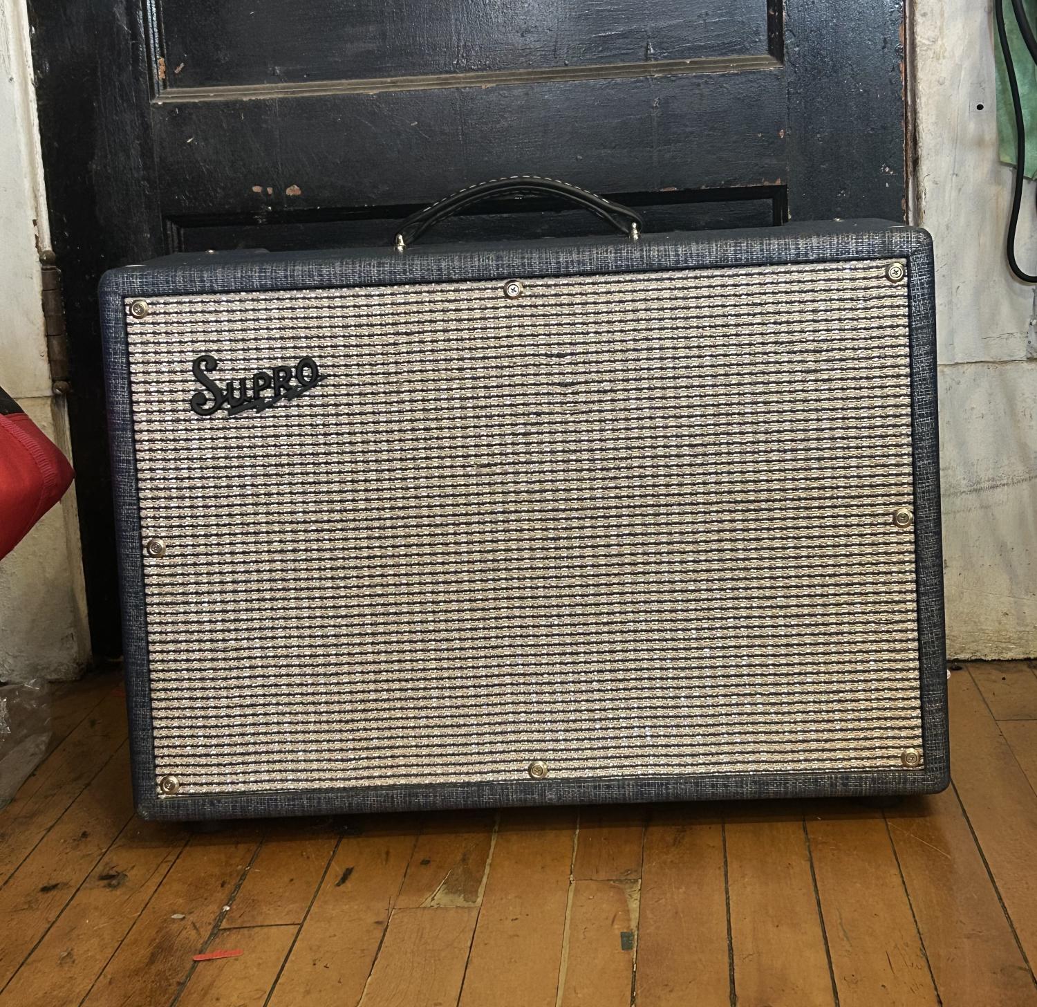 Used Supro jupiter in great shape. This is a 1x12 combo amp equiped with built in reverb, tremolo and attenuation. THe attenuator gives the user the ability to switch between 35,45 and 60 watts. This is a great amp for at home players and gigging/recording musicians alike.