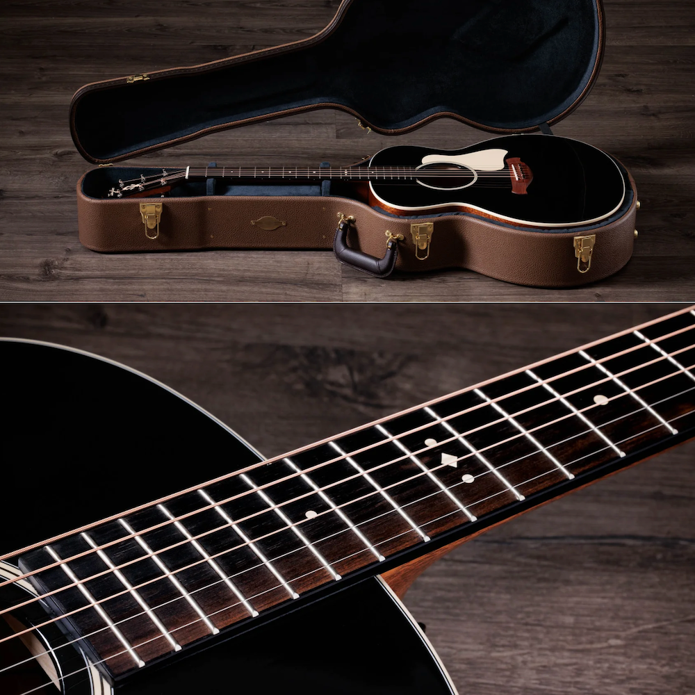 With its bold color treatment and rich midrange voice, the Gold Label 514e Blacktop offers an enticing new entry point to Taylor's Gold Label experience. This Super Auditorium acoustic-electric features back and sides of solid mahogany paired with a torrefied Sitka spruce top, crafted on the foundation of the fanned V-Class bracing introduced with the first models in the collection. Along with the slightly larger dimensions of the Super Auditorium body, those elements add up to a woody, dry tone with a rumbling low-end character and clear power and sustain in the midrange, with a strong fundamental focus and controlled overtones. Visually, this model strikes a bold contrast between its black top finish and cream-colored accents, including Crest fretboard inlays, rosette, binding, and pickguard. Other details include a Curve Wing bridge in Honduran rosewood with matching bridge pins, nickel tuning machines, and a full-body gloss finish. It features LR Baggs Element VTC electronics for warm, authentic plugged-in tone and a deluxe hardshell case with a striking British Cocoa exterior. • MFSKU Gold Label 514e BLKT • UPC 887766140573