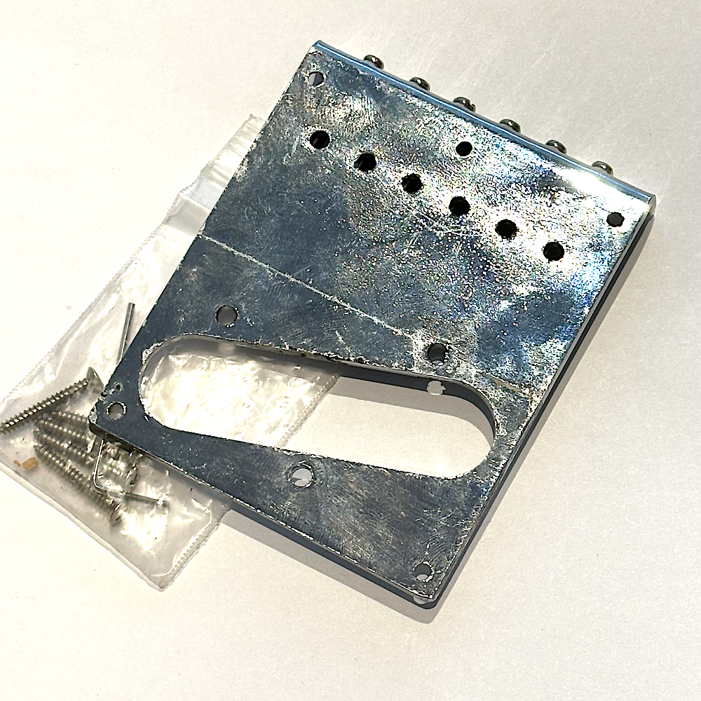 Six saddles and five mounting screws. Length: 98mm (3.858"), Width: 80.5mm (3.169"). E to E spacing: 54mm (2.126"), String spacing: 10.8mm (0.425"). TLB19K-C NOS!