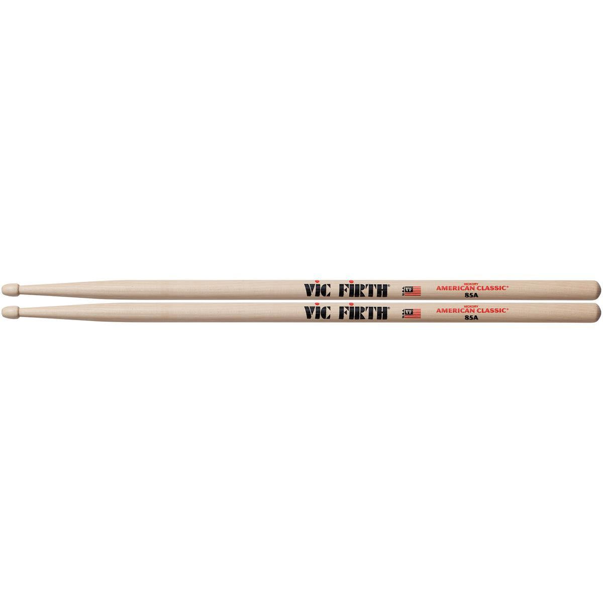 Vic Firth 85A American Classic Drumsticks combine the dimensions of an 8D and 5A making the 85A a great jazz stick. Length: 16" Diameter: .550" American Classic Hickory Drumsticks The American Classic line combines tradition and Vic Firth style. With bold designs for fuller sound, the Classics are turned from select hickory - a dense wood with little flex for a more pronounced sound. Hickory is also capable of withstanding a great deal of shock, making it highly durable. • MFSKU 85A • UPC 750795000821